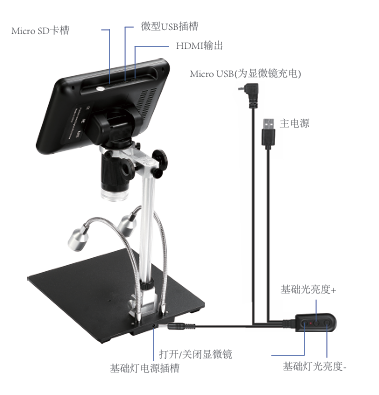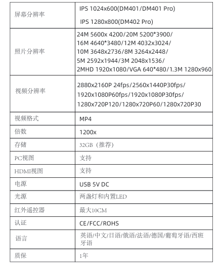 三款型号通过屏幕尺寸与照明系统形成差异化定位:DM401配7英寸屏+顶部环形光,主打高性价比;DM401 Pro升级7英寸屏+双光源(环形光+底部LED)+稳固支架,强化透明样本观测能力;DM402 Pro以10.1英寸大屏+增强透射光为核心,满足专业级精密观测需求。
